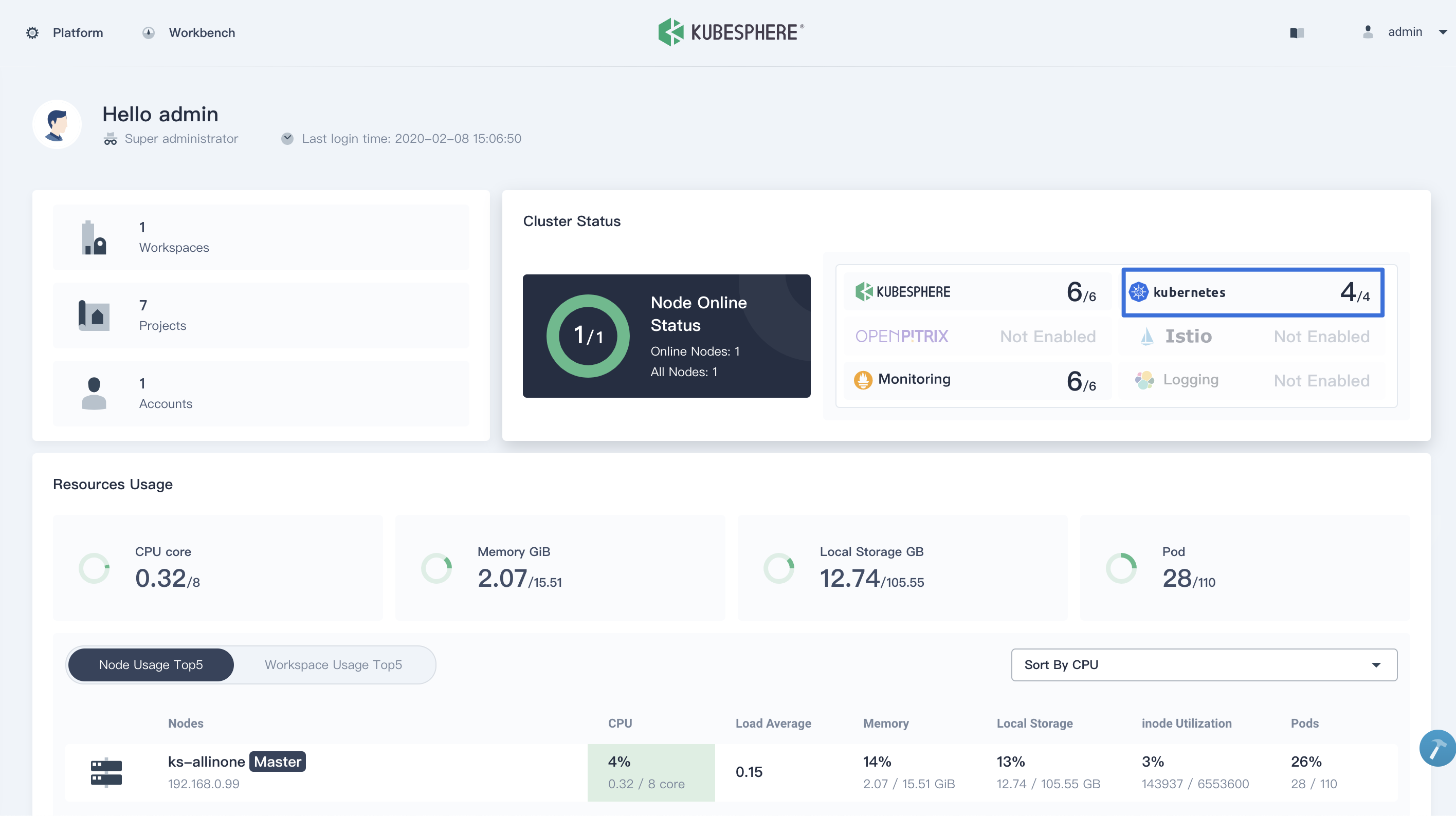 ##################################################### ### Welcome to KubeSphere! ### ##################################################### Console: http://192.168.0.8:30880 Account: admin Password: It will be generated by KubeSphere Installer